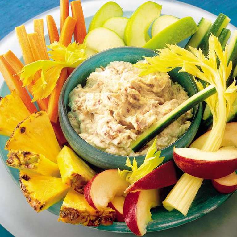 4.Se servește într-un bol sau alt vas adânc înconjurat de un asortiment de crudități.