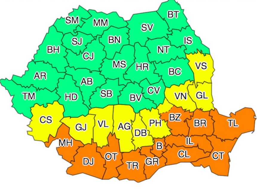Administraţia Naţională de Meteorologie a emis duminică un cod portocaliu de ninsori şi vânt puternic, valabil pentru 12 judeţe din sudul ţării, inclusiv în Capitală.