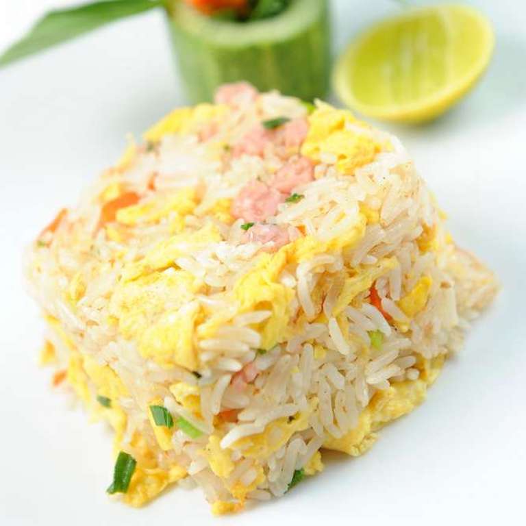 3.Se încinge untul într-o tigaie întinsă, se prăjește șunca 1 minut și se toarnă ouăle. Se rumenește omleta pe ambele părți, după care se taie mărunt cu un cuțit de lemn, direct în tigaie. Se adaugă orezul, se amestecă și se pune amestecul în două boluri.