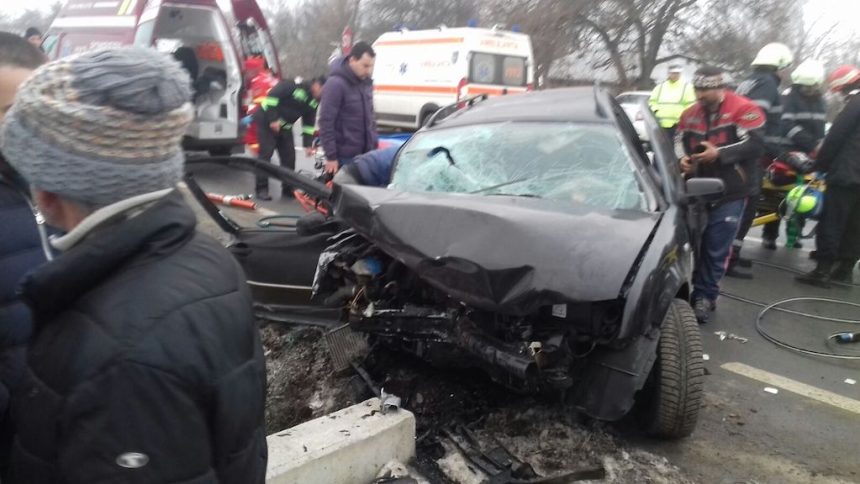 Cinci persoane cu vârste cuprinse între 18 şi 50 de ani au fost rănite grav, după ce maşina în care se aflau a intrat, luni dimineaţă, într-un cap de pod.