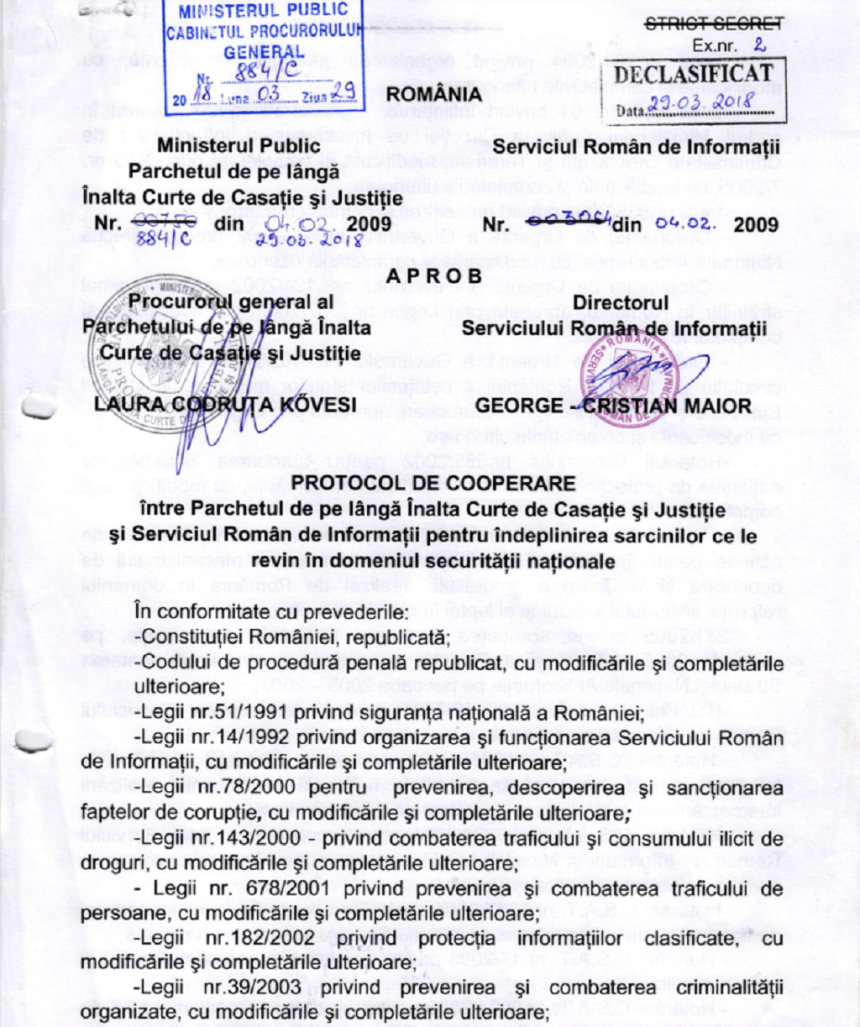 DOCUMENT DECLASIFICAT! Protocolul secret dintre SRI și Parchetul General a fost publicat.