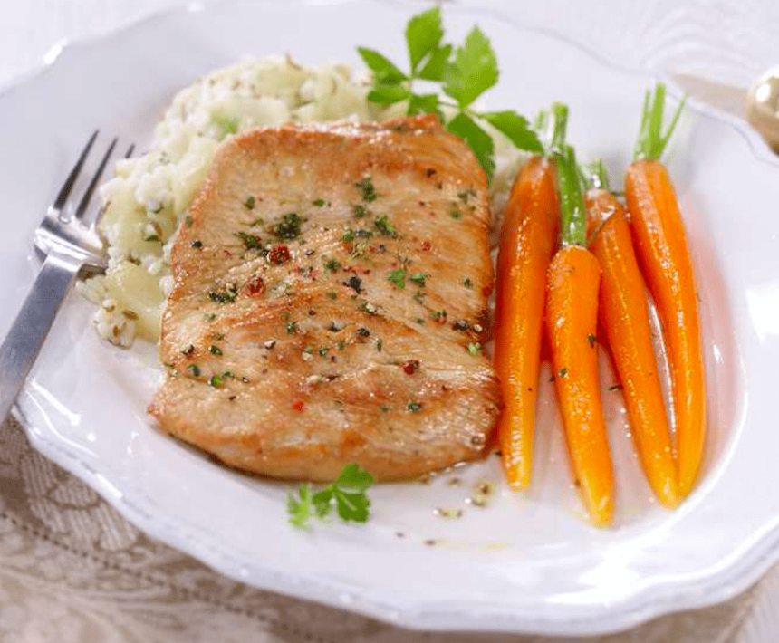 3-Fripturile se spală, se usucă prin tamponare, se condimentează cu sare și piper și se prăjesc în ulei încins aprox. 5-6 minute, pe fiecare parte. Se încinge restul de unt și zahăr și se caramelizează ușor. Se adaugă morcovii, se amestecă și se condimentează cu sare, piper și scorțișoară. Rizoto se rafinează cu smântână și se jumătate din parmezan și se condimentează cu sare, piper și anason. Fripturile de curcan, morcovii și rizoto se așază pe farfurie, se amestecă cu restul de parmezan și se servește, după gust, ornat cu restul de ierburi.