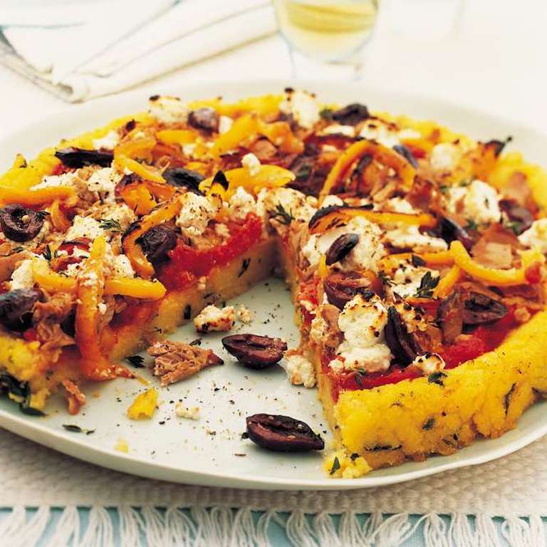 3.Se întinde sosul de roșii peste mămăligă, iar deasupra se pun fâșii de ardei, ton, ricotta și măsline. Se coace 10 minute la cuptor, plasând grătarul la 15 cm distanță de foc. Când plăcinta s-a rumenit, se ornează cu frunze de cimbru și se servește.