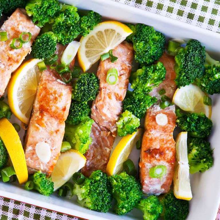 3-Se unge cu ulei un vas termorezistent. Se pun bucăți de somon și buchețelele de brocoli. Se toacă mărunt ceapa și usturoiul și se presară peste ingrediente. Se asezonează cu sare și piper și se coace 15 minute în cuptor, la foc moderat.