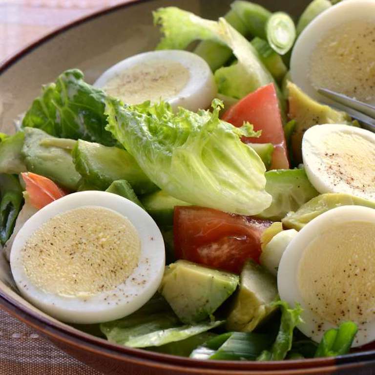 3.Se pun toate ingredientele într-un bol, se stropesc cu ulei de măsline și suc de lămâie și se presară sare și piper. Se amestecă ușor și se pune pe farfurii. Se adaugă rondele de ou fiert, presărate cu piper.
