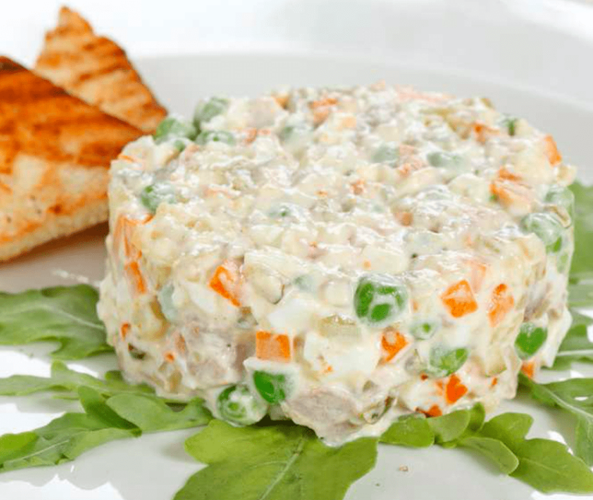 6-Se prepară maioneza și se adaugă peste ingredientele din castron. Se decorează cu maioneză și apoi cu pătrunjel verde, cu albuș de ou fiert, gogoșari, castraveți sau măsline.