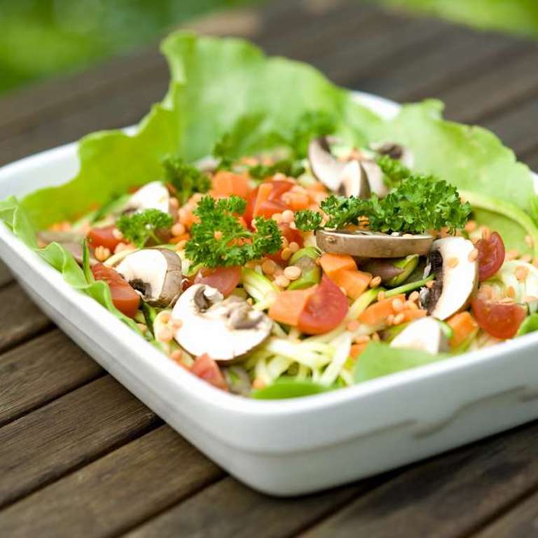 Se toacă varza fideluță. Se montează un pat din frunze de salată pe care se pune varza tocată. Se adaugă roșiile tăiate cubulețe și ciupercile tăiate felii. Se stropește totul cu ulei de măsline și suc de lămâie. Se presară puțină sare și pătrunjel tocat.