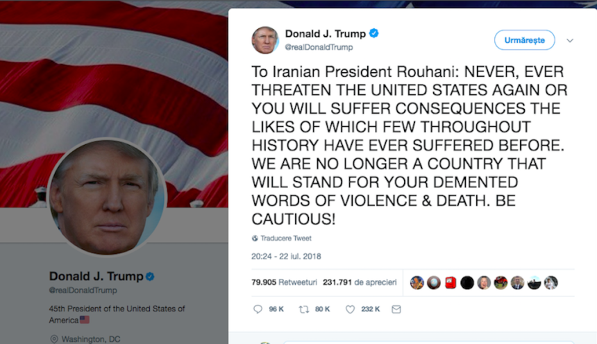 Ameninţare explozivă din partea preşedintelui Donald Trump. Liderul de la Casa Albă a avertizat Teheranul că va suferi consecinţe pe care puţini le-au suferit de-a lungul istorie dacă mai ameninţă Statele Unite.