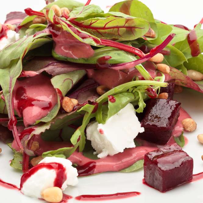 2.Sfecla rămasă se pune pe farfurii împreună cu frunze de rucola, muguri de pin și cuburi de brânză.