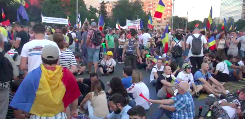 Oameni sunt grupați în centrul pieței, în zona amenajată de jandarmi, încercuită cu garduri de protecție, o altă parte se află pe troturarul din zona Muzeului Antipa, iar dinspre gurilele de metrou se îndreaptă spre Piața Victoriei noi grupuri.