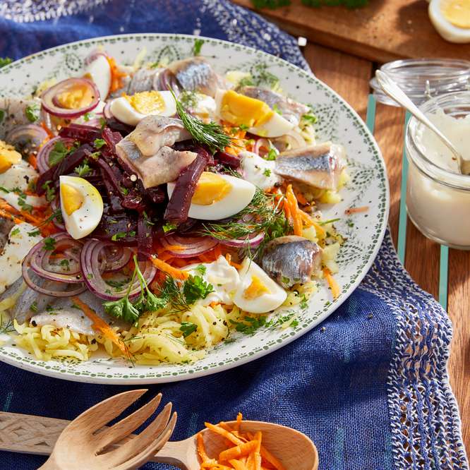 1.Morcovii se curăță și se fierb în apă clocotită cu sare, aproximativ 8 minute. Ouăle se fierb în apă clocotită, aproximativ 10 minute. Între timp, se clătesc fileurile de hering marinat, se usucă prin tamponare și se taie în bucăți potrivite.