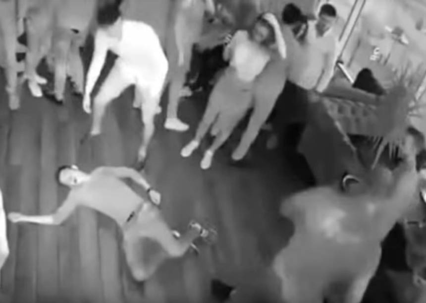 Conflictul a pornit după ce agresorul şi una dintre victime se ciocnesc pe ringul de dans. Bărbatul îşi pune la pământ prima victimă dintr-o lovitură, apoi este împins de un alt individ şi începe să care pumni în stânga şi-n dreapta.