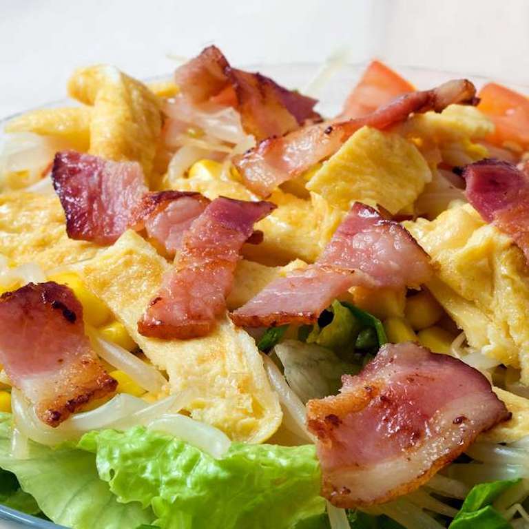 4.Se formează un pat de salată, se adaugă omleta și mugurii de soia iar deasupra se pun feliile de bacon prăjit.