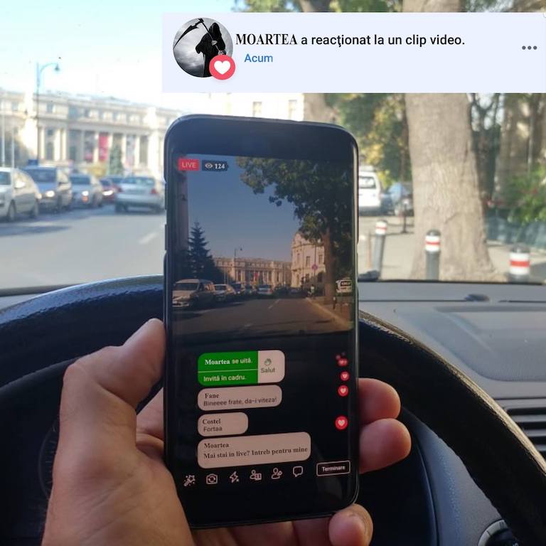 În mesaj a fost ataşată o fotografie trucată în care este arătat un şofer care face live pe Facebook, iar „MOARTEA” îi dă „Love” videoclipului şi comentează „Mai stai in live? Intreb pentru mine”.