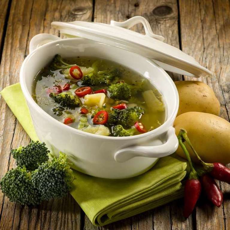 1.Se curăță cartofii și morcovii. Se taie după preferință și se pun la fiert în puțină apă, cât să îi acopere. Când sunt fierți se toarnă supa de legume, fierbinte.