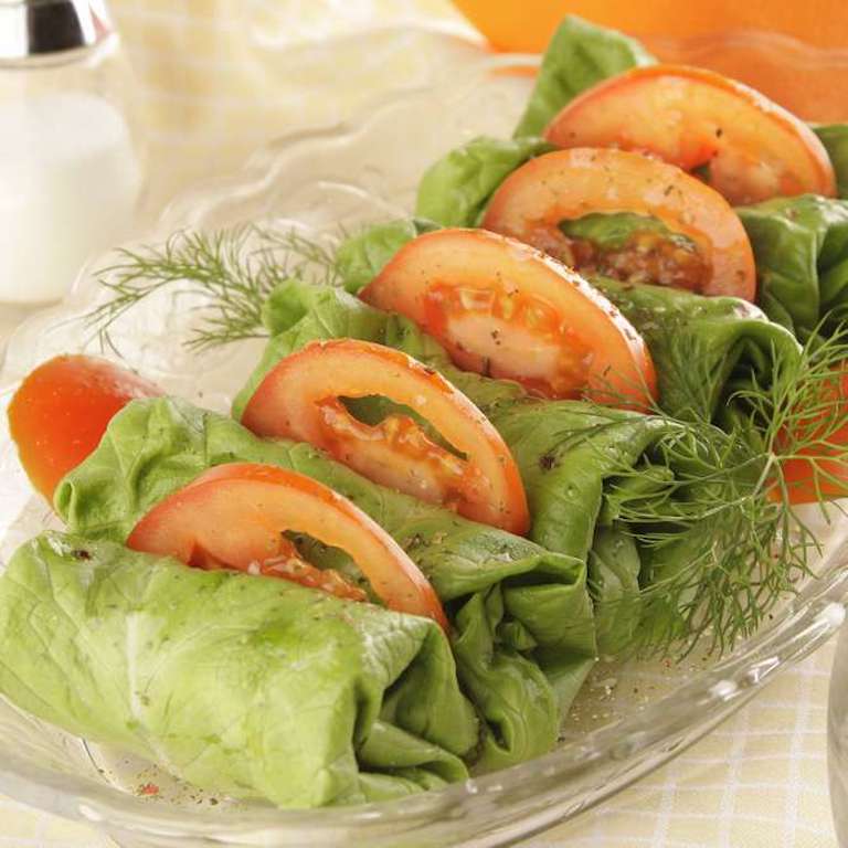 4.Așezi „sărmăluțele“ pe un platou, cu rondele de roșii printre ele. Le stropești cu ulei și presari restul de verdeață tocată foarte mărunt.