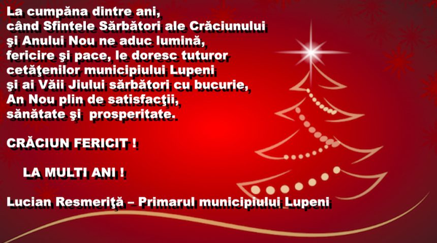 La cumpăna dintre ani, când Sfintele Sărbători ale Crăciunului şi Anului Nou ne aduc lumină, fericire şi pace, le doresc tuturor cetăţenilor municipiului Lupeni şi ai Văii Jiului sărbători cu bucurie, An Nou plin de satisfacţii, sănătate şi prosperitate.