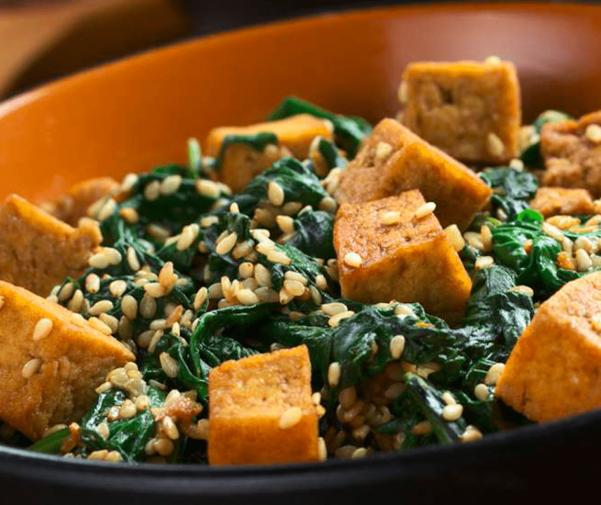 3.Se scoate piureul de spanac pe farfurii, se pun deasupra cuburi de brânză tofu și se presară semințe de susan