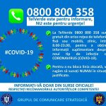 Le reamintim cetățenilor să ia în considerare doar informațiile verificate prin sursele oficiale și să apeleze pentru recomandări și alte informații la linia TELVERDE – 0800.800.358. Numărul TELVERDE nu este un număr de urgență, este o linie telefonică alocată strict pentru informarea cetățenilor. De asemenea, românii aflați în străinătate pot solicita informații despre prevenirea și combaterea virusului la linia special dedicată lor, +4021.320.20.20.