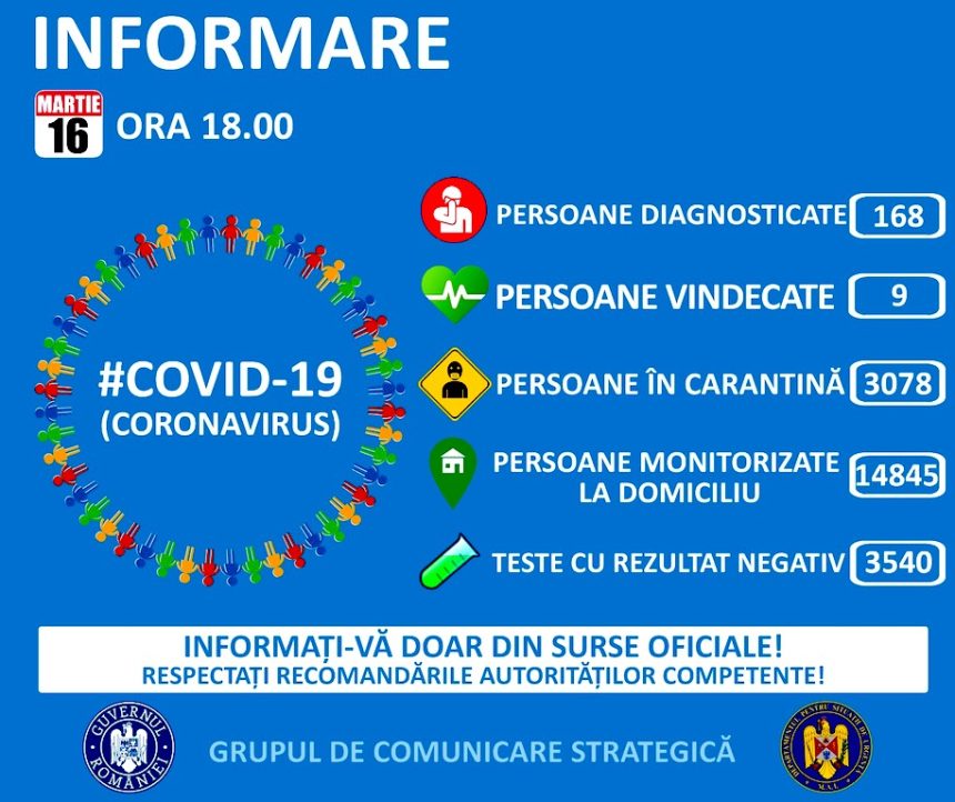 Până astăzi, 16 martie, pe teritoriul României, au fost confirmate 168 de cazuri de persoane infectate cu virusul COVID – 19 (coronavirus). Dintre cei 168 de cetățeni care au contactat virusul, 9 sunt declarați vindecați și au fost externați.