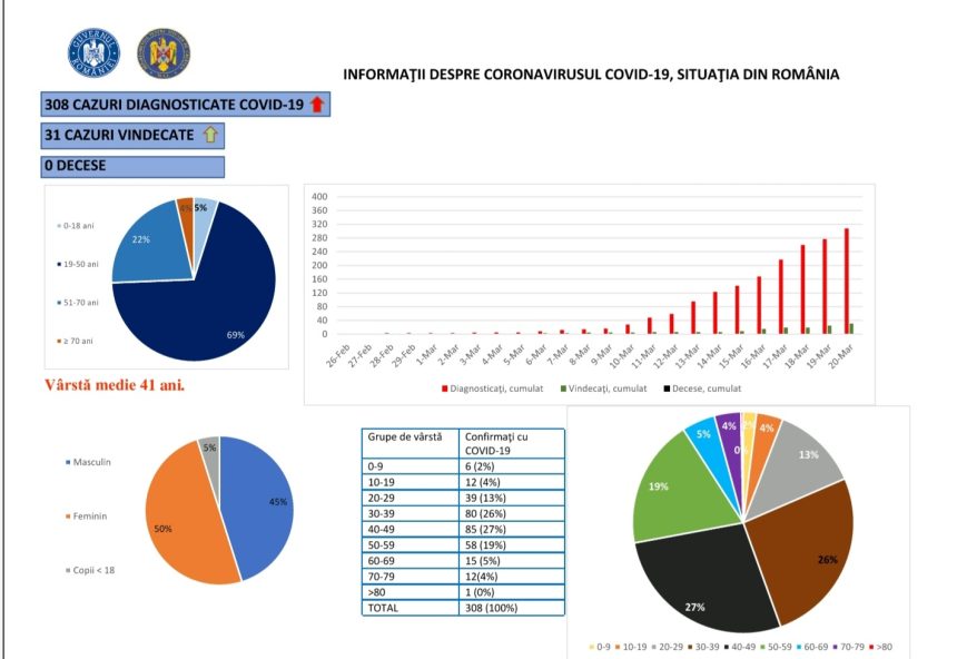 Până astăzi, 20 martie, pe teritoriul României, au fost confirmate 308 cazuri de persoane infectate cu virusul COVID – 19 (coronavirus). Dintre cele 308 de persoane confirmate pozitiv, 31 au fost declarate vindecate și externate (22 la Timișoara, 8 la București și unul la Iași).