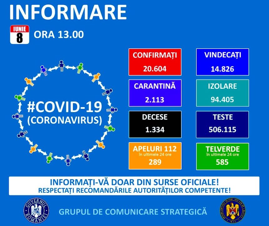 Până astăzi, 8 iunie, pe teritoriul României, au fost confirmate 20.604 de cazuri de persoane infectate cu virusul COVID – 19 (coronavirus). Dintre persoanele confirmate pozitiv, 14.826 au fost declarate vindecate și externate.
