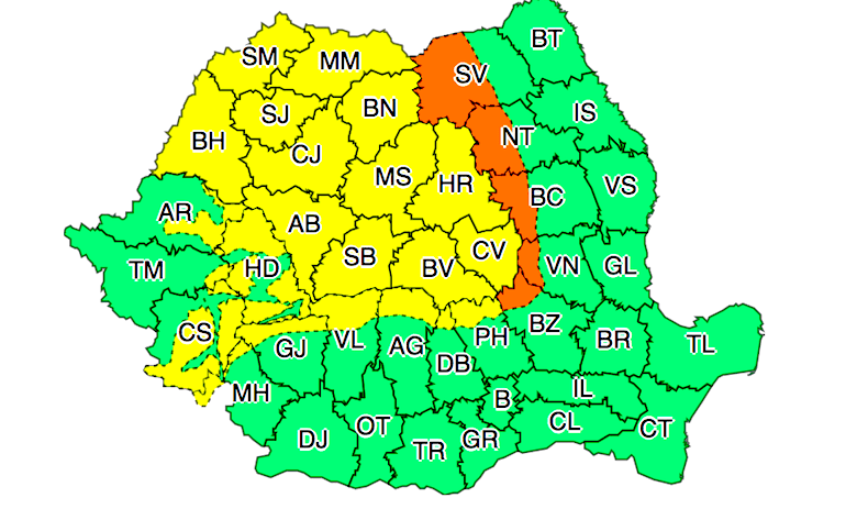 Notă: Intensificări ale vântului, cu viteze în general de 40…50 km/h, se vor semnala local și în restul teritoriului.