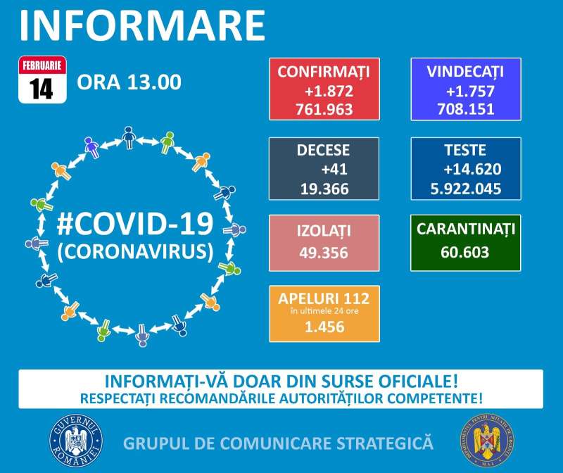 Un număr de 1.872 de cazuri noi de persoane infectate cu SARS-CoV-2 au fost înregistrate în ultimele 24 de ore, în urma efectuării a aproape 15.000 de teste la nivel naţional, a informat, duminică, Grupul de Comunicare Strategică (GCS).