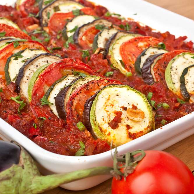 - 3.Pasta de roșii se amestecă cu 5 linguri de ulei, pătrunjel tocat, usturoi pisat, sare și piper. Se toarnă amestecul peste legume și se coc 45 minute la foc moderat.