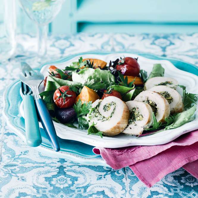 3.Se taie pe jumătate piepții de pui, orizontal, și se aplatizează pentru a ajunge la o grosime uniformă de 1 cm. Se pun 2 linguri de amestec de ierburi pe o bucată de carne și se rulează începând de la capătul îngust. Dacă se dorește, se așază ruloul pe o bucată de prosciutto. Se înfășoară și aceasta. Se leagă ruloul cu sfoară de bucătărie și se repetă operațiunile cu restul de ingrediente.