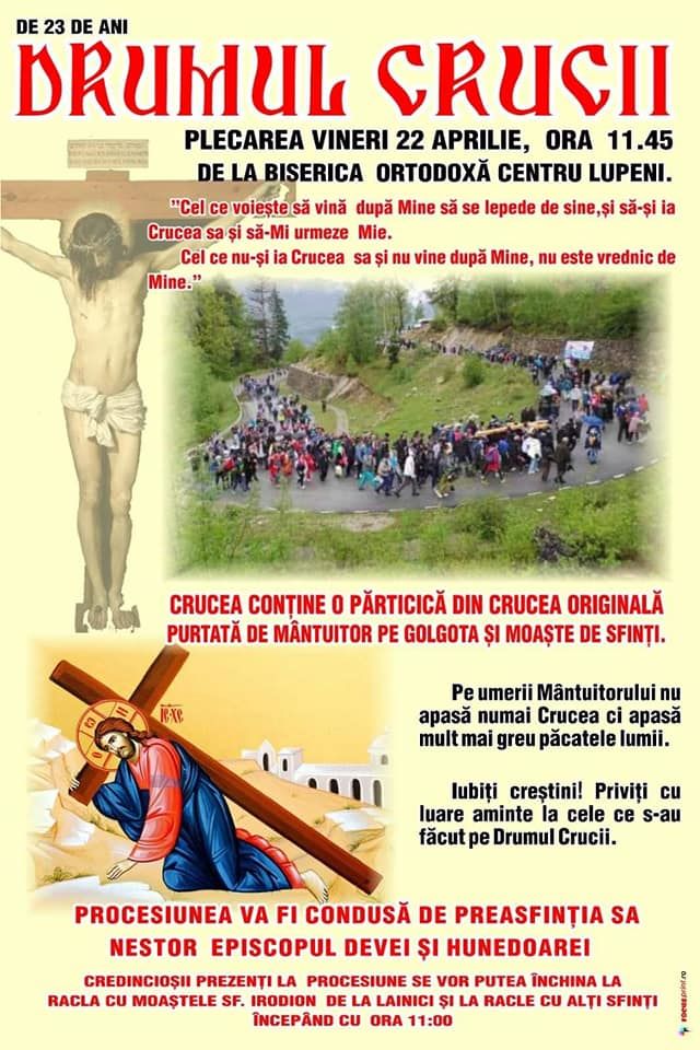 Pe un traseu de zece kilometri între Lupeni şi schitul din Vârful Straja situat la 1.440 de metri altitudine, creştinii însoţesc o cruce din lemn masiv, care cântăreşte peste 100 de kilograme şi este dusă pe braţe de credincioşi. Pelerinajul este unic în România. Oamenii pornesc de la orele amiezii din municipiul Lupeni spre Vârful Straja, într-un pelerinaj religios care imită drumul parcurs de Iisus Hristos în ziua răstignirii pe cruce.