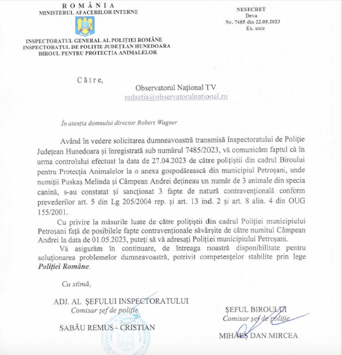 Șantajistul Andrei Câmpean și concubina lui Puskaș Melida au fost sancționați contravențional de către polițiștii Biroului pentru Protecția Animalelor din cadrul IPJ Hunedoara, pentru că-și țineau la o anexă gospodărească trei căței în condiții greu de imaginat. Bietele viețuitoare erau legate cu lațuri scurte încât să nu se poată mișca măcar cât prevăd reglementările în vigoare. Chinul a care erau supuse a luat sfârșit după intervenția autorităților.