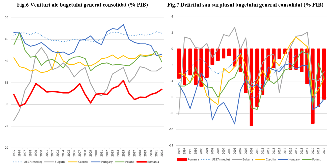 Observațiile formulate mai sus nu sunt însă specifice României. Însă, așa cum arată Figura 6 de mai jos, unul dintre elementele prin care România s-a singularizat în cadrul regiunii pe parcursul ultimilor 27 de ani a fost nivelul în permanență mai redus al veniturilor bugetului general consolidat (ca pondere în PIB) față de celelalte țări. Nu un an, nu cinci, nu zece, ci douăzeci și șapte de ani la rând, ponderea în PIB a veniturilor bugetului general consolidat a fost în cazul României semnificativ mai mică decât în Polonia, Ungaria și Cehia. Inclusiv în Bulgaria ponderea a fost în majoritatea acestei perioade mai ridicată față de România, cu excepția anilor 1995-1996 și 2011.