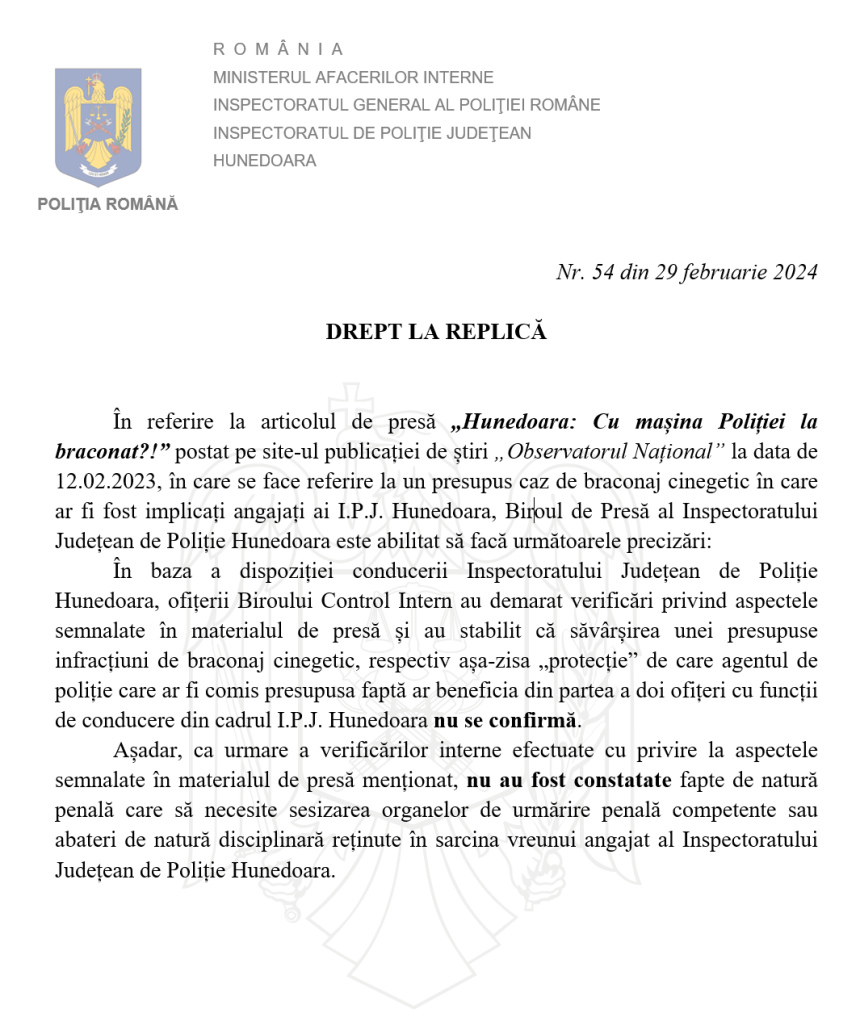În referire la articolul de presă „Hunedoara: Cu mașina Poliției la braconat?!” postat pe site-ul publicației de știri „Observatorul Național” la data de 12.02.2023, în care se face referire la un presupus caz de braconaj cinegetic în care ar fi fost implicați angajați ai I.P.J. Hunedoara, Biroul de Presă al Inspectoratului Județean de Poliție Hunedoara este abilitat să facă următoarele precizări: