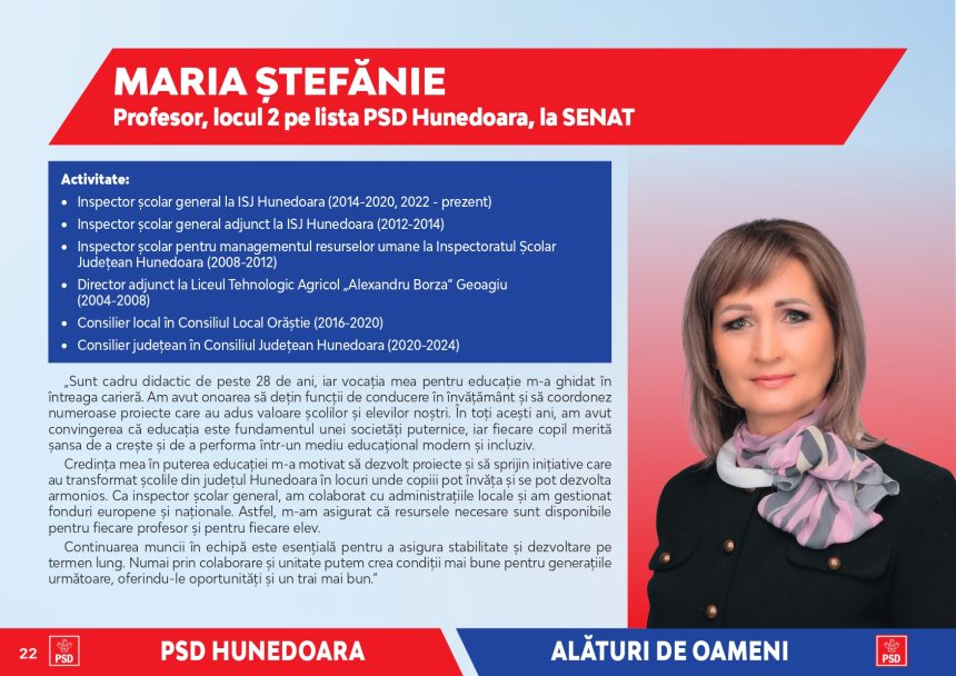 întreaga carieră. Am avut onoarea să dețin funcții de conducere în învățământ și să coordonez numeroase proiecte care au adus valoare școlilor și elevilor noștri. În toți acești ani, am avut convingerea că educația este fundamentul unei societăți puternice, iar fiecare copil merită șansa de a crește și de a performa într-un mediu educațional modern și incluziv.