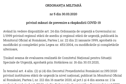 ROMÂNIA MINISTERUL AFACERILOR INTERNE DE ACORD PRIM-MINISTRU LUDOVIC ORBAN ORDONANȚA MILITARĂ nr 5 din 30.03.2020 privind măsuri de prevenire a…