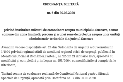 ROMÂNIA MINISTERUL AFACERILOR INTERNE DE ACORD PRIM-MINISTRU LUDOVIC ORBAN ORDONANȚA MILITARĂ nr. 6 din 30.03.2020 privind instituirea măsurii…