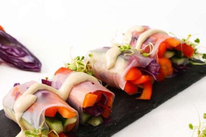 Ingrediente (4 bucăți) Pentru umplutură: 40 g ardei roșu 40 g castravete 40 g varză roșie 40 g morcov Pentru dressing:…