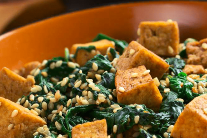 Ingrediente (2 porții) 200 g brânză tofu 30 g semințe de susan 1 kg spanac 3 căței de usturoi ulei…